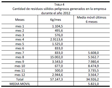 TABLA 4 Cantidad de residuos sólidos peligrosos generados en la empresa durante el año 2012