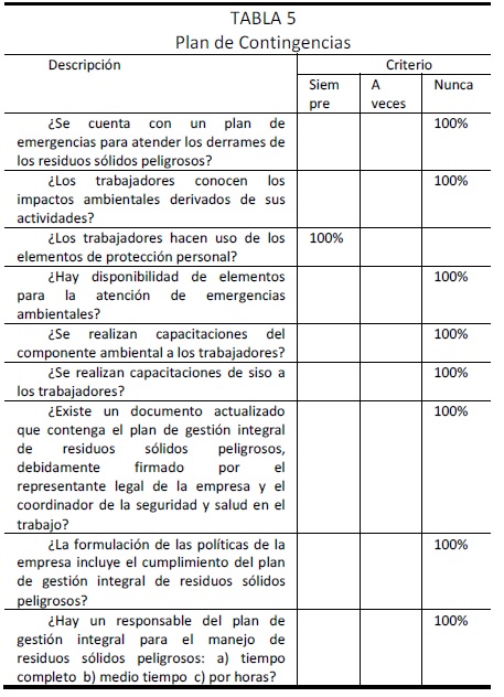 Por último se encontró un alto grado de desconocimiento tanto de la parte administrativa como del personal directamente involucrado al mantenimiento de los vehículos, en todo lo relacionado al plan de contingencia para el manejo de accidentes e incidentes ocasionados por la mala disposición de los residuos peligrosos (ver tabla 5).