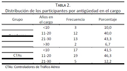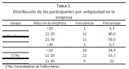 La distribución de los trabajadores en cuanto a sus tiempos de servicio en la empresa, considerando todos los cargos desempeñados, se muestra en la tabla 1. En ambos grupos, más del 50% de los participantes en el estudio tenían tiempos de servicio en la empresa de más de 10 años. El 40% de los Bomberos aeronáuticos llevan entre 11 y 20 años de antigüedad y el 50% de los mismos entre 20 y 30 años. Por otro lado, se registró una media de 20 años y una mediana de 23 años de antigüedad para este grupo. Entre los CTAs, el 53,7% llevan en la empresa entre 11 y 20 años y el 22% entre 20 y 30 años, con una media de 18 años y una mediana de 17 años respectivamente.