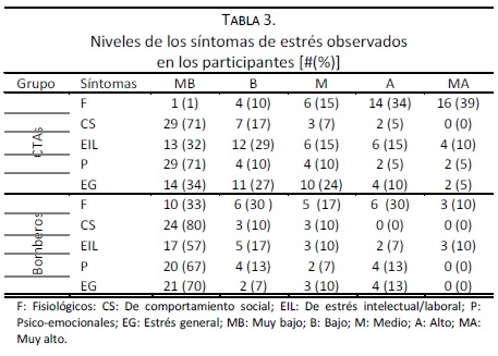 Se realizó un análisis en el nivel de síntomas de estrés a nivel general, en el grupo de controladores de tránsito aéreo y bomberos aeronáuticos (ver tabla 3).