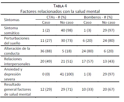 Luego de caracterizar los síntomas de estrés observados en ambos grupos de trabajadores, se procedió a evaluar la presencia de alteraciones en la salud mental en los mismos para buscar posibles relaciones de causa/efecto significantes estadísticamente. Los resultados en cuanto a la presencia de síntomas de alteraciones en la salud mental se presentan en la tabla 4. Estos resultados muestran que el 88% del grupo de controladores presenta alteraciones de la conducta y el 49% presenta dificultades en las relaciones interpersonales. Por su parte, el 80% del grupo de bomberos presenta alteraciones de la conducta y el 57% presenta dificultades en las relaciones interpersonales.