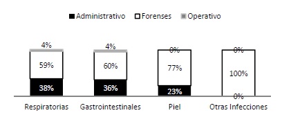Los eventos según el oficio, muestra que las infecciones de piel ocurren con mayor prevalencia en oficios forenses con un 77% seguido de las infecciones gastrointestinales y respiratorias, con un 60 y 59% respectivamente (ver Figura 2).