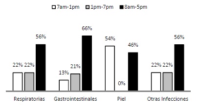 Los eventos según jornada laboral muestra que la prevalencia para infecciones gastrointestinales, respiratorias y otras infecciones se presenta en el turno de 8 am a 5 pm, con un 66%, 56% y 54% respectivamente; mientras que las infecciones de piel se distribuyen equitativamente en horarios de 7am a 1pm con un 54% y de 8am a 5pm con un 46% (P<0.05).