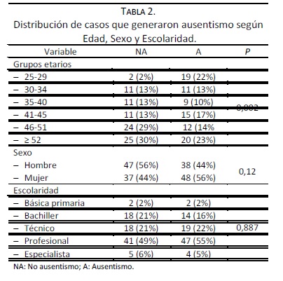 Al analizar comparativamente las variables sociodemográficas en el personal forense que no ha presentado ausentismo frente a los ausentes, se observa que: el 30 % de los no ausentes tiene más de 52 años, seguido por el 29% entre 46 a 51 años, mientras que los ausentes tienen distribución homogénea según los grupos de edad, el 23% tienen más de 52 años, el 22% entre 25 y 29 años y el 17% entre 41 a 45 años (P<0.05). Lo cual es estadísticamente significativo (ver Tabla 2). Respecto a la variable sexo las mujeres presentaron mayor ausentismo representado por un 56%, mientras que en el grupo no ausentes los hombres representaron al 56% (P>0.05). En cuanto a escolaridad, tanto en el grupo de no ausentismo como los que sí han tenido ausentismo, la mayor frecuencia se presenta en los profesionales, 49% y 55% respectivamente (P>0.05).