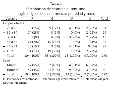 TABLA 4 Distribución de casos de ausentismo según origen de la enfermedad por edad y sexo.