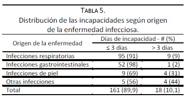 TABLA 5. Distribución de las incapacidades según origen de la enfermedad infecciosa.