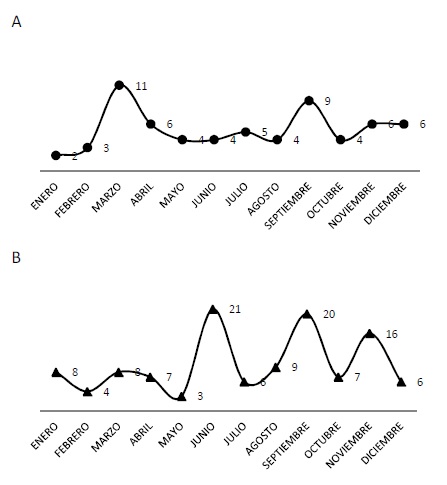 FIGURA 1. Frecuencia de eventos de ausentismo laboral mes a mes, durante al año 2011. A) año 2011; B) año 2012.