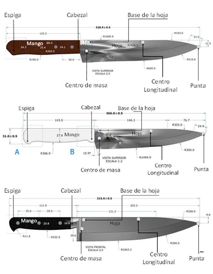 FIGURA 1. Dimensiones de las herramientas de corte de línea profesional de 8 pulgadas y localización de las marcas referenciales para seguimiento y reconstrucción 3D. A. Cuchillo 1 Cuchillo 2 elaborado en acero inoxidable y mango en madera, de una longitud total de 328,9 mm, longitud del mango 125,5 mm, ancho de la hoja 38.9 mm, espesor del mango de 13 mm, altura del mango de 26,3 mm, con un radio al final del mango de 5 mm y un radio en el centro del mango del cuchillo de 350 mm. B. elaborado en acero inoxidable especial y mango de polipropileno texturizado de una longitud total de 366 mm, longitud del mango 143 mm, ancho de la hoja 39,6 mm, espesor del mango de 13 mm, altura del mango de 31 mm, con un radio al final del mango de 6 mm y un radio en el centro del mango del cuchillo de 386.9 mm C. Cuchillo 3 elaborado en acero al carbono de una longitud total de 315 mm, longitud del mango 111,9 mm, ancho de la hoja 39.6 mm, espesor del mango de 15.6 mm, altura del mango de 24 mm, con un radio al final del mango de 11.6 mm y un radio en el centro del mango del cuchillo de 332.9 mm.