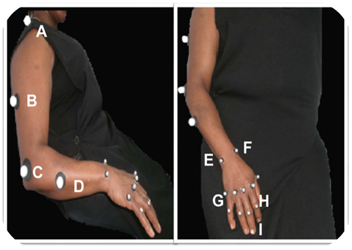 Ubicación de marcadores: Las marcas referenciales blancas que permitieron el seguimiento de los movimientos de cada participante durante la acción de corte se ubicaron en brazo, antebrazo-mano y vestido como se muestra en la figura 2. Previo a la filmación se vistió cada participante con un delantal de tela color negro mate. Los datos del desplazamiento de las marcas referenciales se usaron como guías para realizar la reconstrucción en 3D por medio del software Kwon 3D XP (Copyright © 1993-2006 VISOL) en la extremidad superior dominante. Los puntos anatómicos cuyo movimiento se siguió en detalle fueron: el acromion (A), el centro de masa del brazo (B), el epicóndilo medial del brazo (C), el epicóndilo lateral del brazo, el anconeo, centro de masa del antebrazo (D), la apófisis espinosa de la ulna (E), la apófisis espinosa del radio (F), cada falange proximal de los dedos (G), la falange media del II, III, IV y V dedo (H) y la falange distal del III dedo (I) (Figura 2).