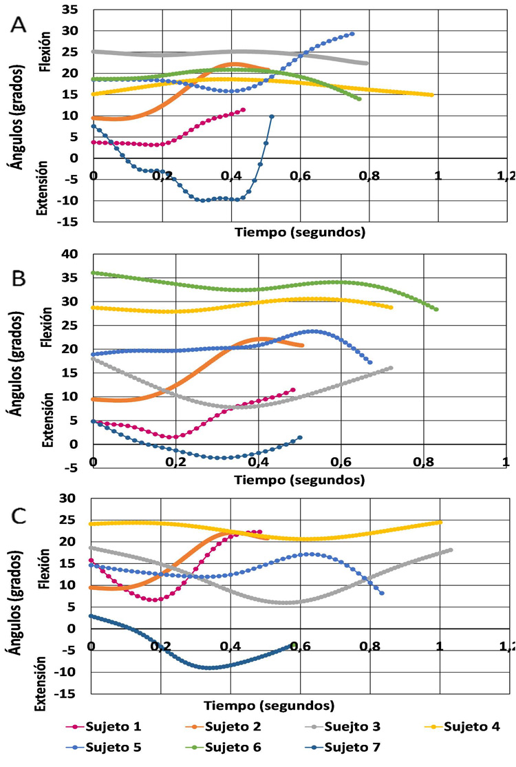 FIGURA 3. Rango de movilidad (ángulos) en Flexión – Extensión con las tres herramientas de corte A. Cuchillo 1 B. Cuchillo 2; C. Cuchillo 3. Utilizados por cada participante del estudio con la mano dominante en el periodo de tiempo del corte de la papa.