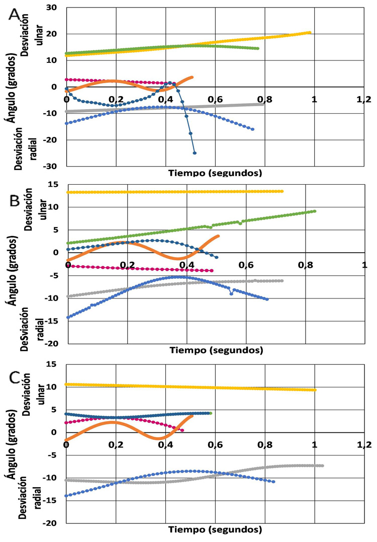 FIGURA 4. Rango de movilidad (ángulos) en desviación Radial y Ulnar con las tres herramientas de corte. A. Cuchillo 1; B. Cuchillo 2; C. Cuchillo 3. Utilizados por cada participante del estudio con la mano dominante en el periodo de tiempo del corte de la papa. El código de colores es el mismo de la figura 3.