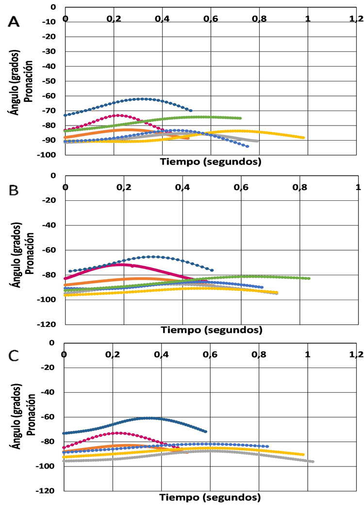 FIGURA 5. Rango de movilidad (ángulos) en Pronación con las tres herramientas de corte. A. Cuchillo 1, B. Cuchillo 2; C. Cuchillo 3. En todos los participantes los ángulos del movimiento de pronación se mantuvieron dentro de rango correspondiente a los ángulos movilidad articular normal de cada participante. El código de colores es el mismo de la figura 3.
