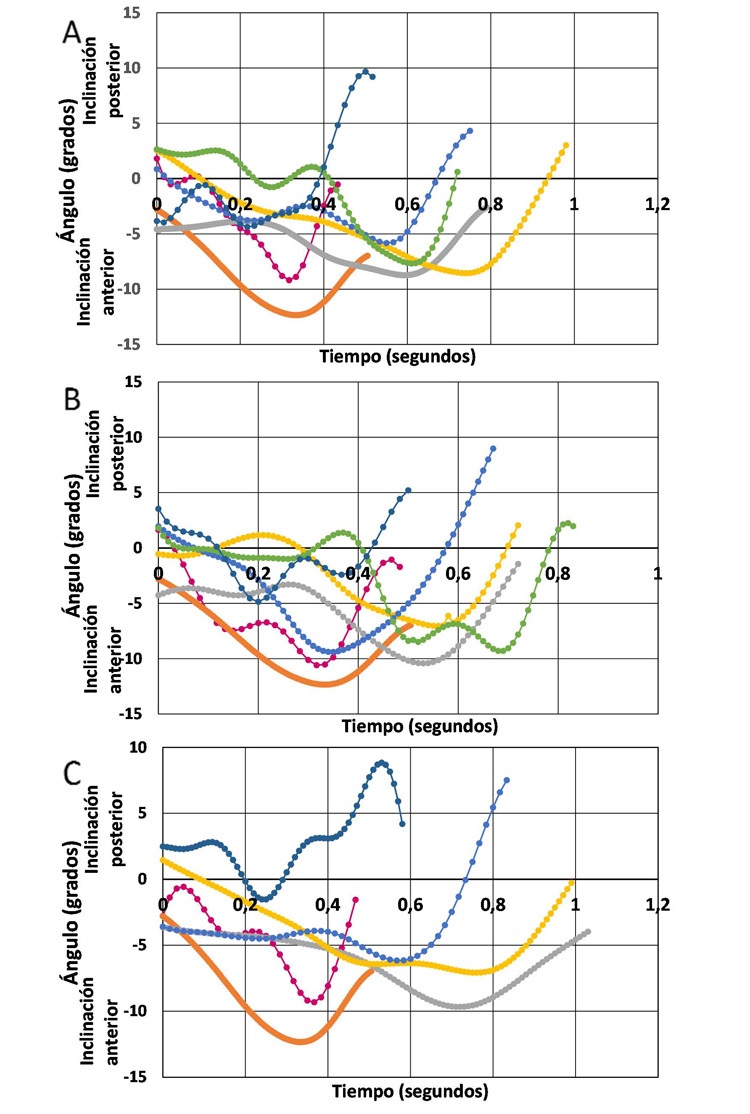 En un movimiento óptimo del corte de papa se espera que la oscilación antero posterior del cuchillo sea mínima y por el contrario el movimiento requiera un predominio de la inclinación anterior a la vez que la herramienta se desplaza hacia adelante. El análisis de la figura 6 revela que durante el movimiento de corte el cuchillo 3 se mantiene con mayor frecuencia en una posición de inclinación anterior. Los participantes 4, 5 y 6 realizan el movimiento de corte con el cuchillo 3 incluyendo un número de oscilaciones menor que con los cuchillos 1 y 2. Esta herramienta promueve que el movimiento de corte guarde mayor cercanía al corte óptimo que los cuchillos 1 y 2.