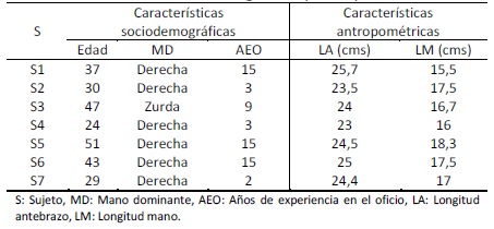 La edad de las participantes osciló entre 26 y 36 años al momento del estudio. Se observó que la experiencia en el oficio en años es variable con rangos que van de 2 a 17 años. El 85.71% de la población tiene mano dominante derecha.