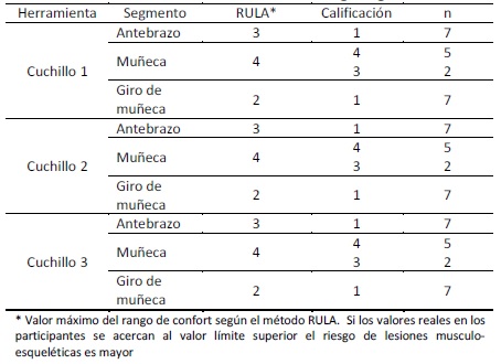 Evaluación de riesgo biomecánico: La evaluación del riesgo biomecánico se realizó mediante el método RULA (Rapid Upper Limb Assessment).9 El método de evaluación implica la asignación de una puntuación en una escala de riesgo sobre cada segmento corporal derivada los ángulos medidos con el software KWON 3D XP en antebrazo y muñeca durante el movimiento de corte. Estos valores se comparan con los valores de ángulos de referencia establecidos por el método para obtener una puntuación final por cada segmento. El método permite generar una calificación que establece la existencia del riesgo de aparición de lesiones musculo esqueléticas.