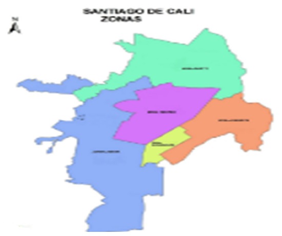 FIGURA 5: Cartografía tematica de los trabajos de grado ejecutados en el Sector Educación. La cartografia describe la localización geográfica de las 9 investigaciones realizadas por los estudiantes de la especialización en salud ocupacional, en el area urbana de Santiago de Cali en el período 1997-2010.