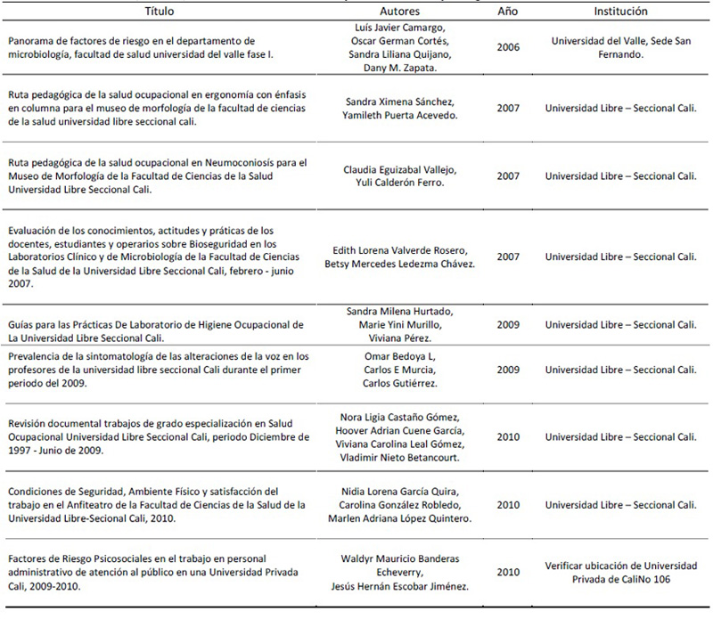 7. REVISIóN DOCUMENTAL DE TRABAJOS DE GRADO ESPECIALIZACION SALUD OCUPACIONAL UNIVERSIDAD LIBRE. SECCIONAL CALI.