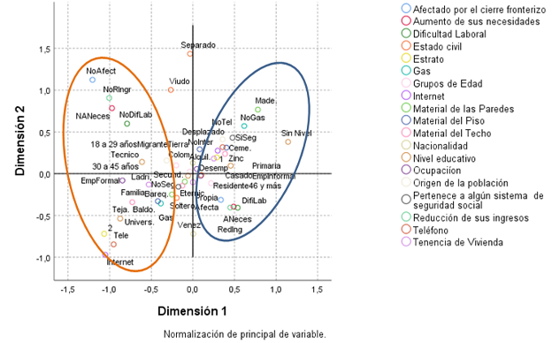 El tratamiento estadístico de los datos incluyó un análisis exploratorio y descriptivo bivariado, lo que permitió identificar patrones generales en las condiciones socioeconómicas de los hogares encuestados. Dada la naturaleza categórica de las variables, se empleó el Análisis Multivariado de Correspondencias Múltiples (ACM), como técnica estadística que facilita la reducción de la dimensionalidad de grandes matrices de datos categóricos y permite establecer relaciones de interdependencia entre variables. El procedimiento se ejecutó mediante escalamiento óptimo, una técnica que asigna cuantificaciones numéricas a las categorías de las variables a través del método iterativo de mínimos cuadrados alternantes (Greenacre, 2007; Meulman, Van der Kooij & Heiser, 2004).